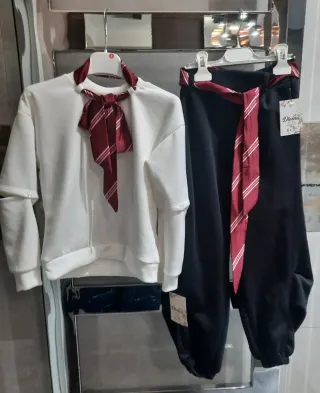Set composto da felpa bianca e pantaloni neri, con fiocco coordinato. - Felpa girocollo con maniche lunghe. - Pantaloni con elastico in vita e alle caviglie. - Fiocco a righe bordeaux e bianche.