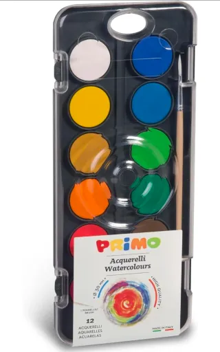 PRIMO - Acquerelli per Bambini Artisti, 12 Colori + 1 Pennello Acquerello per Dipingere, Kit Tavolozza per Dipingere Pittura, Colori per Bambini +3 Anni Acquerellabili Diametro 30mm Lavoretti Creativi