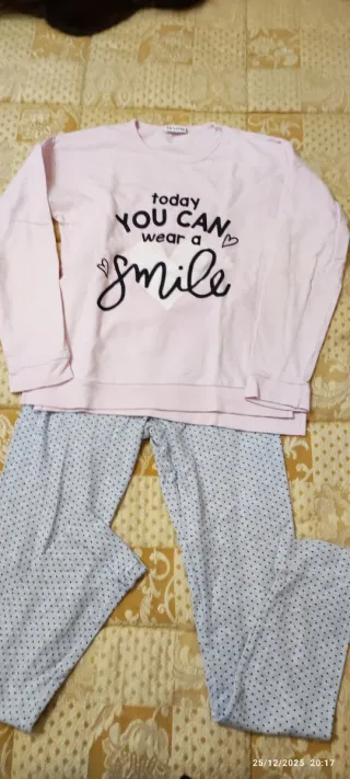 Pigiama per bambina composto da maglia a maniche lunghe e pantaloni lunghi. - Maglia rosa con stampa today you can wear a smile. - Pantaloni grigi a pois neri.