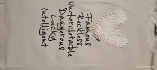 Maglietta a maniche lunghe con una stampa di un cuore e parole. - Cuore decorato con texture. - Scritta Famous, Reckless, Unforctable, Dangerous, Lucky, Intelligent.