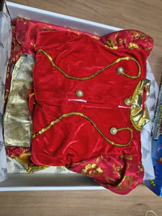 Costume da odalisca per bambina, taglia S. Perfetto per feste in maschera o recite. - Colore rosso con decorazioni dorate. - Include copricapo e cintura.