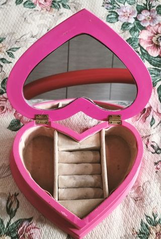 Portagioie in legno a forma di cuore con specchio e porta anelli Purtroppo si e tolto il colore su tre piccoli punti come da foto Il cuore è di 22 cn x 17 e ha un' altezza di 5 cm