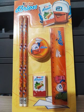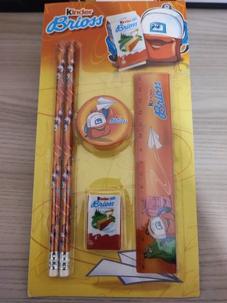 Set scuola da 5 pezzi firmato Kinder brioss Composto da: 2 matite con gommino 1 temperamatite 1 gomma 1 righello
