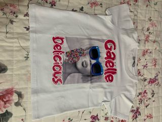 Maglietta bianca originale Gaëlle Paris con stampa. - Taglia 10. - Stampa con ragazza, occhiali da sole blu e scritta Gaëlle delicious.