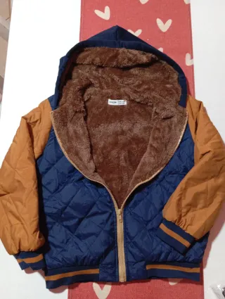 Caldo giubbotto per bambino con interno in morbida pelliccia. - Maniche color cuoio. - Corpo trapuntato blu. - Cappuccio foderato. - Polsini e fondo a costine.