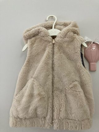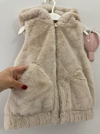 Morbido gilet in pelliccia sintetica color beige, perfetto per aggiungere un tocco di calore e stile. - Tessuto in finta pelliccia soffice. - Design con cappuccio integrato. - Chiusura frontale con zip. - Tasche applicate sul davanti.