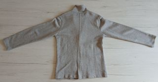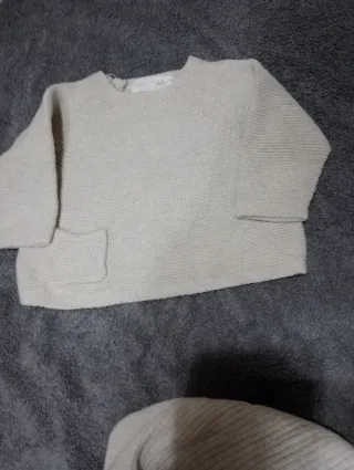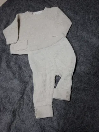 Completo maglia per neonato colore beige composto da un maglioncino a maniche lunghe con una tasca frontale e pantaloni abbinati a costine con bottoni alla caviglia (tagliate le etichette perché troppo lunghe)