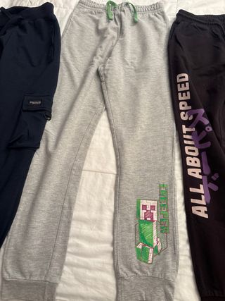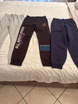 Set di tre pantaloni per bambino. - Pantaloni grigi con laccetti verdi. - Pantaloni marrone scuro con stampa ALL ABOUT SPEED e fulmine. - Pantaloni blu scuro con stampa SONIC THE HEDGEHOG.