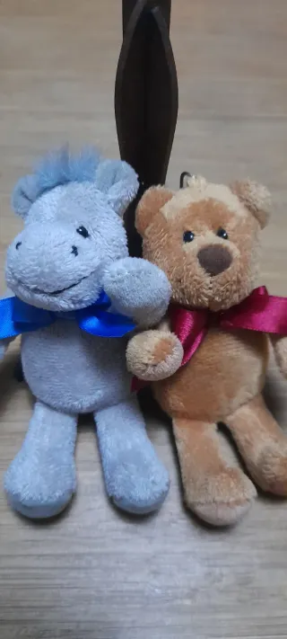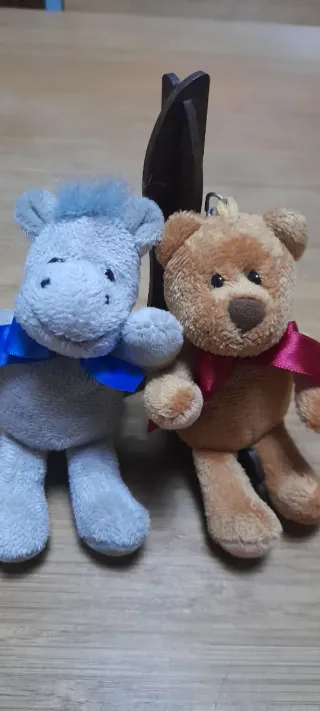 Set di due portachiavi in peluche, un ippopotamo azzurro e un orsetto marrone - Ippopotamo con fiocco blu. - Orsetto con fiocco bordeaux.