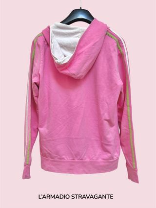 La felpa mostrata nelle immagini è una felpa con cappuccio di colore rosa acceso, dallo stile sportivo e casual. Descrizione frontale: • Chiusura con zip centrale. • Sul lato sinistro del petto si nota la scritta ricamata “MC Magicstar” in bianco. • Sul lato destro, sono applicate in tessuto spugnoso le cifre “99” di colore verde chiaro. • Presenta due tasche verticali con bordi bianchi. • Interno del cappuccio foderato in bianco panna. Descrizione posteriore: • Il retro è semplice, ma le maniche sono decorate da una doppia striscia laterale: una verde chiaro e una bianca, che percorrono tutta la lunghezza fino ai polsini. •