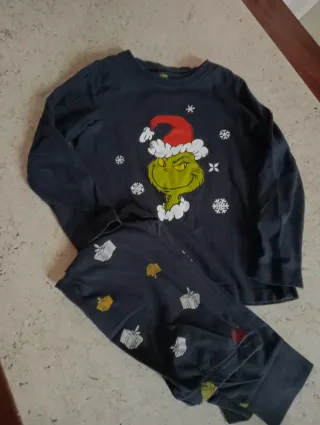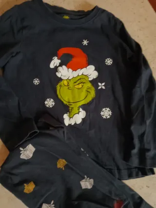 Set pigiama a tema natalizio con il Grinch. Ideale per i più piccoli. - Maglia a maniche lunghe blu scuro. - Pantaloni blu scuro con stampa di pacchi regalo e fiocchi di neve. - Taglia 5 anni.