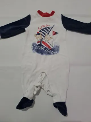 Dolce tutina per neonato con un simpatico disegno a tema marino. 1-3 mesi 56 cm - Maniche lunghe blu navy. - Collo rosso. - Stampa Ocean Waves con orsetti su una barca a vela. - Piedini integrati blu navy. - Chiusura con bottoncini a pressione sul davanti.