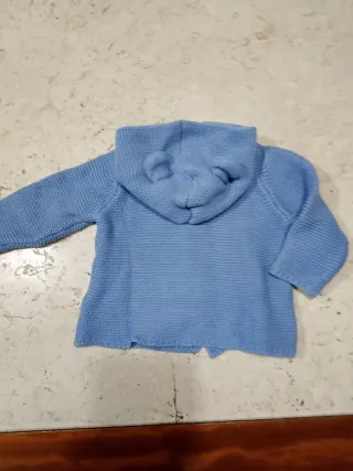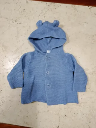 Morbido cardigan azzurro per neonato, taglia 3/6 mesi, con simpatico cappuccio a forma di orsetto. - Chiusura con bottoni. - Maniche lunghe. - Tessuto in maglia.