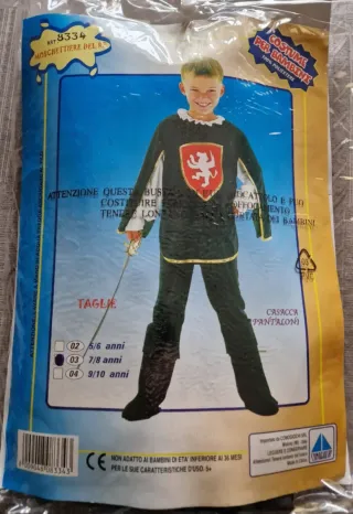 Vestito di carnevale da Moschettiere del Re per bambino. Taglia indicata sulla confezione 7/8 anni. Misure visibili in foto. Include casacca, pantaloni e mascherina. Usato in una sola occasione, ottime condizioni, presenta una lieve abrasione del tessuto in corrispondenza di un ginocchio (vedi ultima foto). - Materiale: 100% Poliestere - Maschera Musketiere inclusa.