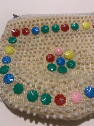 Portamonete giocattolo, piccolino in plastica, decorato con perline multicolor applicate, chiusura con zip. Qualche pietruzza mancante. Anni ‘90