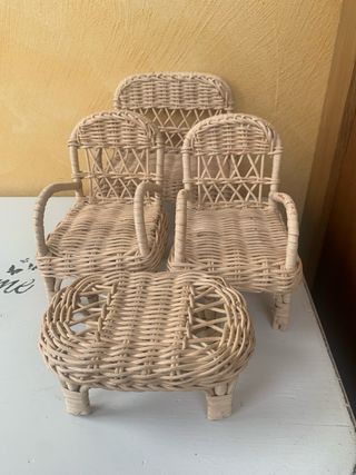 Grazioso salotto completo per Barbie e bamboline in vimini intrecciato, composto da 2 poltroncine con braccioli 1 divannetto e 1 tavolino da caffè. Perfettamente integri, senza alcuna rottura. Anni ‘80