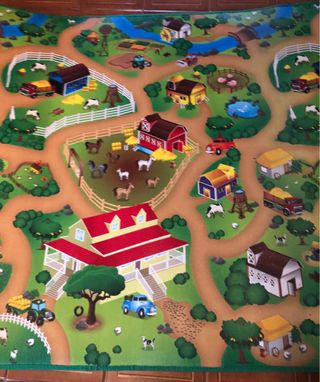 Tappeto da gioco per bambini con tema fattoria, in ottimo stato. - Design colorato con fattoria, animali e veicoli. - Ideale per il gioco creativo e l'apprendimento. - Materiale resistente e facile da pulire.