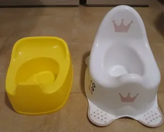 Set di n.2 pezzi (due) vasini per bambini, uno giallo monocolore e uno bianco con decorazioni rosa a forma di corona.