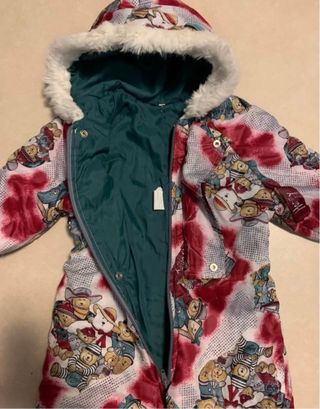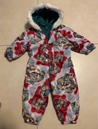 Tuta da sci per bambina, taglia 9-12 mesi, con una simpatica stampa di orsetti. - Fantasia con orsetti e dettagli rossi. - Cappuccio con bordatura in pelliccia sintetica. - musica 12 mesi - marchio Pimmy