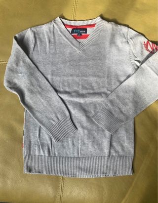 Maglione grigio per bambino, taglia 8 anni (128 cm). - Scollo a V con dettagli rossi. - Polsini e fondo a costine. - Logo sulla manica. #maglionebimbo #maglionescollov #bimbo8anni #bimbo128cm #maglionearighe #comenuovo #ycc
