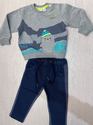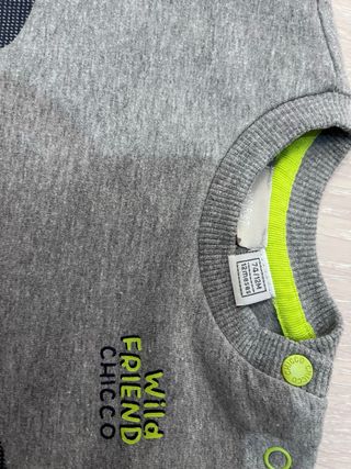 Bellissimo completo Chicco in felpa per neonato, con stampa di una foca e paesaggio montano. - Felpa grigia con dettagli blu e gialli. - Pantaloni blu scuro con laccetti in vita. - Stampa Wild Friend Chicco sulla felpa.