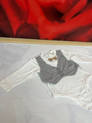 Body in morbido jersey di cotone. Papillon cucito in alto e maniche lunghe. Panciotto in misto lino cucito sopra con taschino decorativo e bottoni davanti. Bottoni automatici su una spalla e in basso.