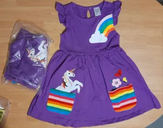 Coppia di vestitini identici viola, perfetti per gemelle e sorelle che amano vestirsi coordinate. Viola con arcobaleno sul corpetto, maniche corte a volant, un magico unicorno ricamato sulla gonna, con dettagli di fiori e farfalle e due taschine frontali a righe arcobaleno. 100% cotone, made in China, taglia5T (4-5 anni) sono nuovi ancora nella confezione originale.