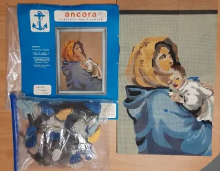 Kit completo per ricamo a mezzopunto vintage della celebre marca Ancora (Anchor) della Madonna con Bambino un classico dell'arte sacra perfetto per essere incorniciato una volta terminato. Il kit comprende tela canovaccio stampata con il disegno a colori sulla trama per facilitare il lavoro, matassine originali necessarie per il lavoro e un ago tutto in confezione originale. Come visibile dalle foto il lavoro è già stato iniziato, una parte della tela e già ricamata accuratamente. Misure del lavoro 37x44