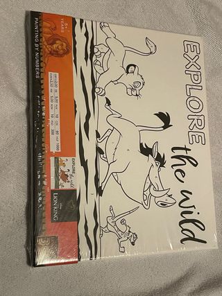 Immagine da dipingere con i numeri, basata sul Re Leone. È nuovo e in perfette condizioni! - Include tela e colori. - Ideale per bambini @s dai 5 anni in su. - Divertimento garantito dipingendo Simba, Timon e Pumbaa.
