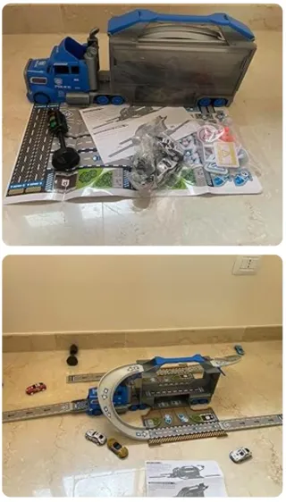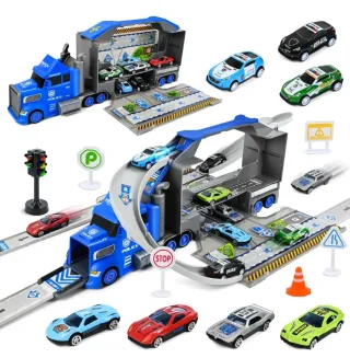 Set di gioco con camion e pista per macchinine. - Camion blu con rimorchio trasparente. - Pista con curve e accessori. - Include diverse macchinine.