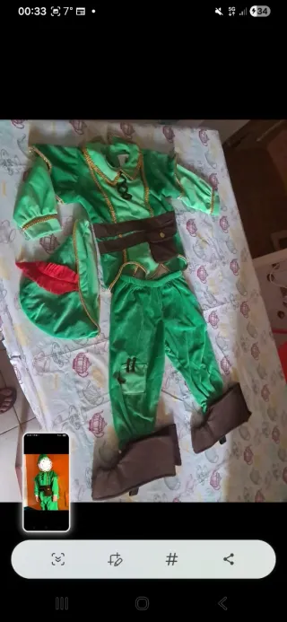 Costume da Peter Pan per bambino, completo di cappello e cintura. - Colore verde brillante. - Dettagli dorati sul colletto e sui polsini. - Cintura marrone con tasca applicata.