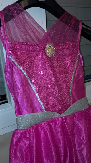 Vestito da bambina ispirato a Barbie, perfetto per feste o giochi di ruolo. - Corpetto scintillante con paillettes rosa. - Cintura argentata. - Gonna ampia in tessuto lucido rosa. - Dettagli in tulle trasparente sulle spalle.
