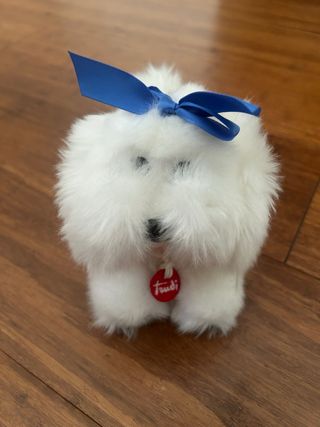 Simpatico pupazzetto Trudi a forma di cane bianco. Perfetto per i più piccoli o come oggetto da collezione. - Morbido pelo bianco. - Fiocco blu sul capo. - Targhetta rossa Trudi con logo.
