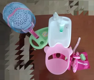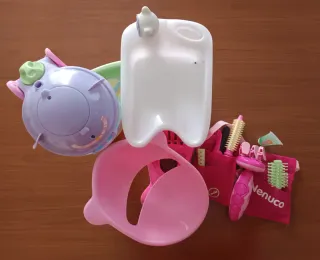 Set da parrucchiera Nenuco con accessori. - Lavatesta bianco. - Accessori rosa e viola. - Borsa porta accessori Nenuco. -Casco funzionante