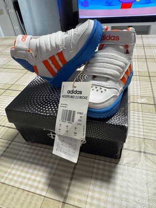 Scarpe Adidas Hoops Mid 3.0 Micke per bambino. - Colore bianco con dettagli arancioni e suola blu. - Chiusura a strappo. - Modello mid-top.