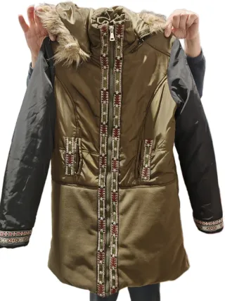 Giacca Desigual con cappuccio e dettagli etnici. - Maniche in tessuto diverso dal corpo. - Bordi decorati con passamaneria. - Tasche frontali con patta. - Imbottitura leggera.