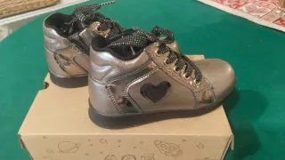 Bellissime scarpine per bambina, numero 28, completamente nuove. - Colore grigio metallizzato. - Dettaglio a forma di cuore nero glitterato. - Chiusura con lacci neri e zip laterale. - Fodera interna calda e morbida.