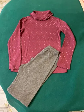 Set composto da maglioncino a collo alto con pois bianchi e leggings grigi. - Maglioncino bordeaux con fantasia a pois bianchi. - Collo alto con volant. - Leggings grigi in tessuto morbido.