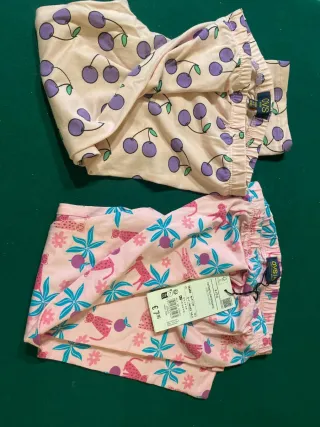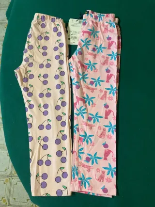 Set di due leggings per bambina. - Un paio con stampa di ciliegie viola su sfondo rosa chiaro. - Un paio con stampa di leopardi e foglie tropicali su sfondo rosa. - Marchio OVS.