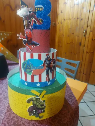 Torta finta a tema Avengers, perfetta per una festa di compleanno. - Personaggi inclusi: Iron Man, Spiderman, Captain America, Hulk. - Decorazione con numero 3 glitterato blu. - Base decorata a mattoni gialli. - Livelli decorati con stelle e logo Avengers.