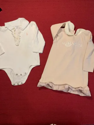 Lotto composto da due capi d'abbigliamento per bambina. - Body bianco a maniche lunghe con colletto e volant sul davanti, logo Ralph Lauren. - Vestitino rosa a maniche lunghe con logo Moncler e balza sul fondo.