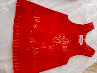 Bellissimo coordinato Clayeux per neonata, composto da 5 pezzi. - Cardigan arancione con fantasia floreale e bottoni rossi. - Maglietta gialla a maniche lunghe con stampa. - Vestitino rosso con ricamo di fiore e scritta plum pi...dou. - Calzini arancioni con fiori. - Cappellino arancione con pompon. - misura 12 mesi 74cm