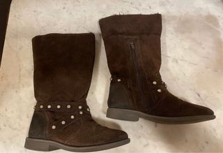 Stivaletti Zara in camoscio con dettagli in pelliccia e borchie. Molto caldi perché sono foderati di pelliccia ecologica fino alla caviglia. Si possono indossare sia dritti che con risvolti di pelliccia.Sono di camoscio marrone, misura 31 - Materiale: camoscio - Dettagli: pelliccia sintetica, borchie metalliche - Chiusura: zip laterale