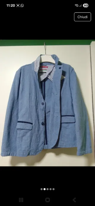 Giacca blu per bambino, perfetta per occasioni speciali. - Tessuto leggero e confortevole. - Dettagli a contrasto sul colletto e sui polsini. - Taschino sul petto.