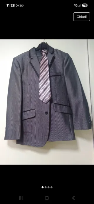 Elegante completo per bambino, ideale per occasioni speciali. - Giacca grigia con righe sottili. - Fantasia geometrica sulla cravatta.