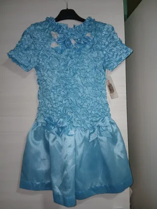 Bellissimo vestitino azzurro per bambina, ideale per occasioni speciali o per tutti i giorni. - Tessuto leggermente ruvido sul corpetto e maniche corte. - Gonna in raso lucido. - Dettagli floreali sul collo. - Fiocchi decorativi sulla gonna.