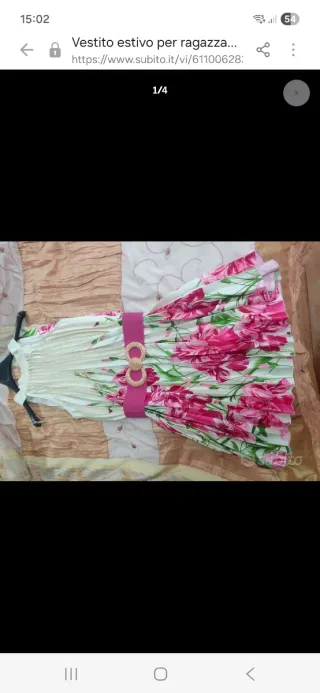 Vestito estivo con fantasia floreale, ideale per le giornate calde. - Fantasia con fiori fucsia e foglie verdi. - Cintura fucsia con fibbia decorativa. - Tessuto leggero e plissettato. -taglia unica, mia figlia veste una S