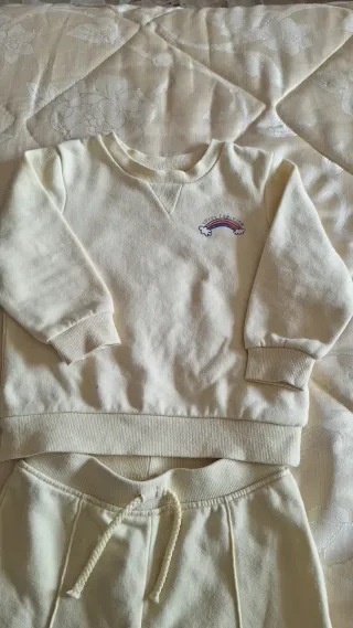 Tutina in felpa per neonato, taglia 18-24 mesi. Perfetta per i mesi più freddi. - Interno felpato per un maggiore comfort. - Colore giallo tenue. - Pantaloni con elastico in vita e laccetto regolabile. - Felpa con stampa arcobaleno sul petto.