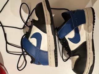 Vendo un paio di scarpe Nike Dunk Low per bambini. Sono in buone condizioni, con qualche segno di usura. - Modello: Nike Dunk Low - Colore: Blu e nero - Numero: Da verificare sulla scarpa - Perfette per bambini numero 22