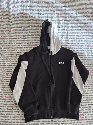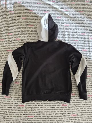 Felpa con cappuccio e zip, perfetta per bambini di 7 anni. - Colore nero con dettagli bianchi sulle maniche. - Cappuccio foderato in bianco. - Chiusura frontale con zip.